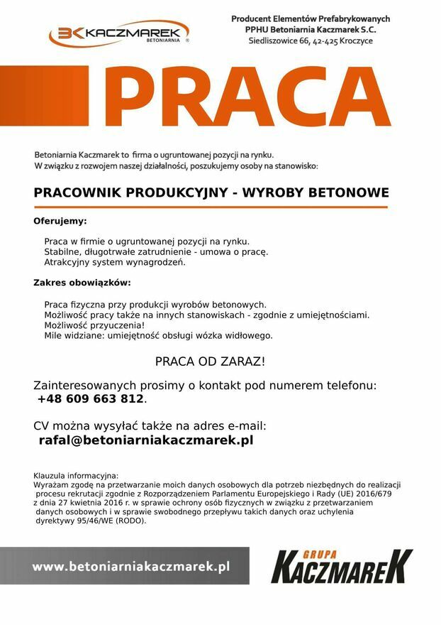 - Pracodawca: Betoniarnia Kaczmarek